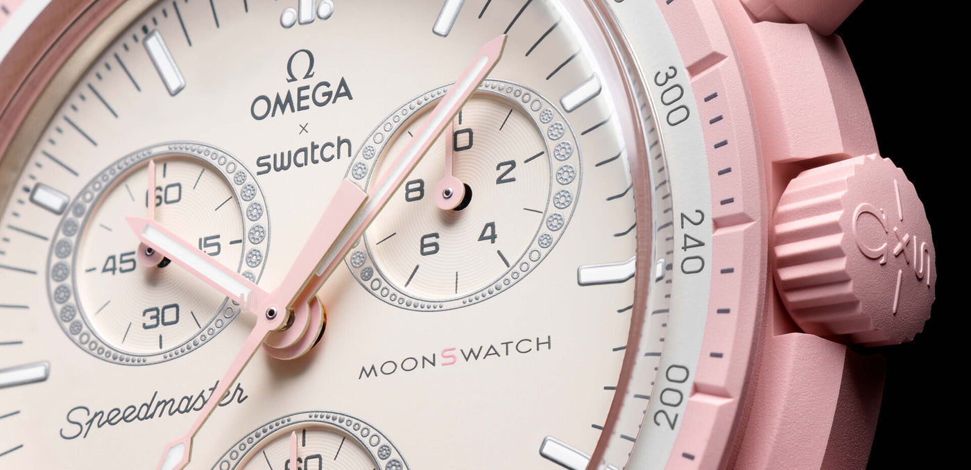 A pulseira branca de VELCRO® deste modelo não limitado contrasta perfeitamente com o rosa pastel atalcado. Os submostradores ovais, adornados com detalhes em formato de diamante nas bordas, e a luneta bicolor em rosa e branco adicionam um toque de elegância. Os ponteiros de horas, minutos, segundos do cronógrafo e os ponteiros do submostrador são em rosa. Todos os mostradores da coleção ostentam a marca OMEGA X Swatch, o icônico logotipo Speedmaster e o logotipo MoonSwatch. A construção em vidro de origem biológica, o "S" gravado integrado no centro do vidro, o padrão circular fino e sofisticado no anel externo do mostrador e nos submostradores recuados, a construção angular e suave das asas, o icônico detalhe "ponto sobre 90" na escala taquimétrica e, claro, a exclusiva sensação biocerâmica são comuns a todos os modelos. Os ponteiros de horas, minutos e segundos do cronógrafo, bem como os marcadores de horas, ostentam Super-LumiNova® para um brilho perfeito no escuro.